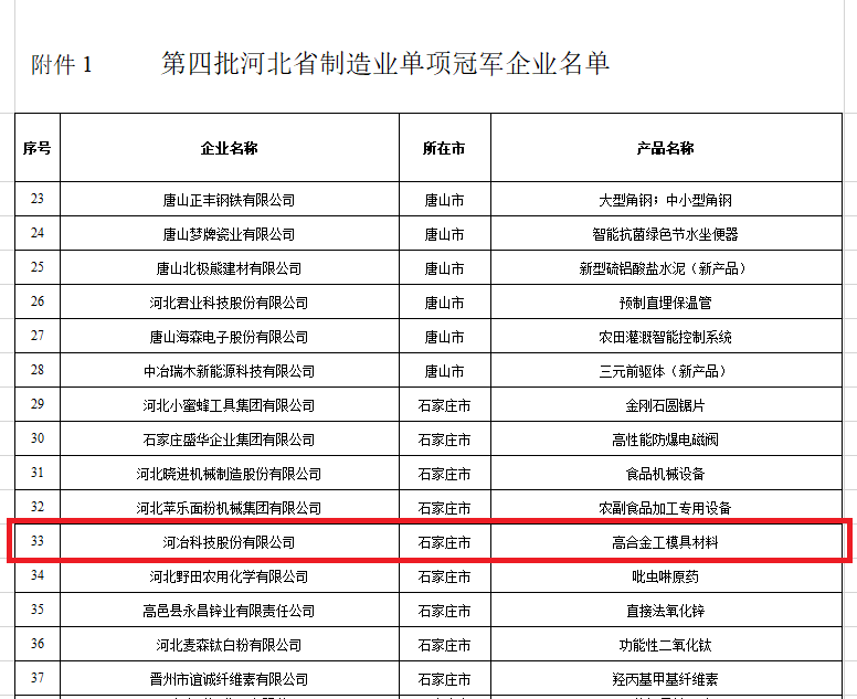 近日,河北省工業(yè)和信息化廳發(fā)布《關(guān)于公布第四批河北省制造業(yè)單項(xiàng)冠軍企業(yè)名單的通知 冀制強(qiáng)省辦〔2022〕25號(hào)》。經(jīng)企業(yè)申報(bào)、各市工信部門推薦、專家評(píng)審、現(xiàn)場(chǎng)抽查、公示,確定了河北省第四批制造業(yè)單項(xiàng)冠軍企業(yè)(產(chǎn)品)名單,通過公示期,河冶科技股份有限公司獲得河北省單項(xiàng)冠軍企業(yè)認(rèn)定。