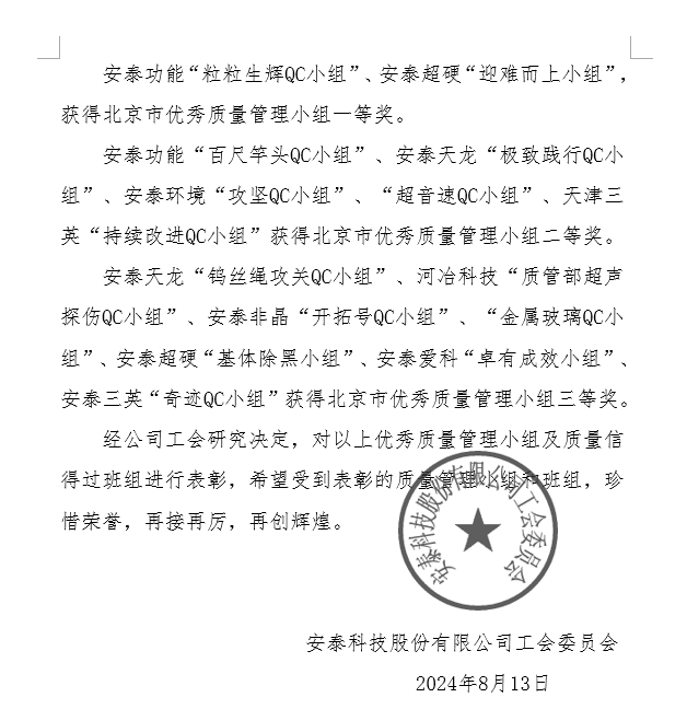 為鼓勵員工參與質量提升及改善活動,提高質量意識和創新能力,持續進行質量改善、降低消耗、提高工作效率,河冶科技-質管部超聲探傷QC小組榮獲中央企業、北京市優秀質量管理小組三等獎, 2023年安泰科技第十一屆優秀質量管理小組二等獎。